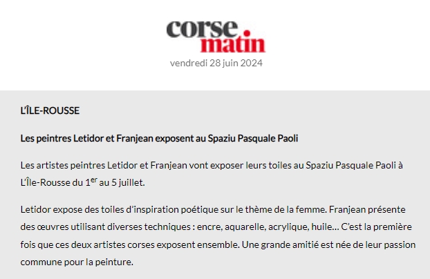 2024 Juillet – Exposition d’art intemporel – Spaziu Pasquale Paoli – Ile Rousse – Haute-Corse